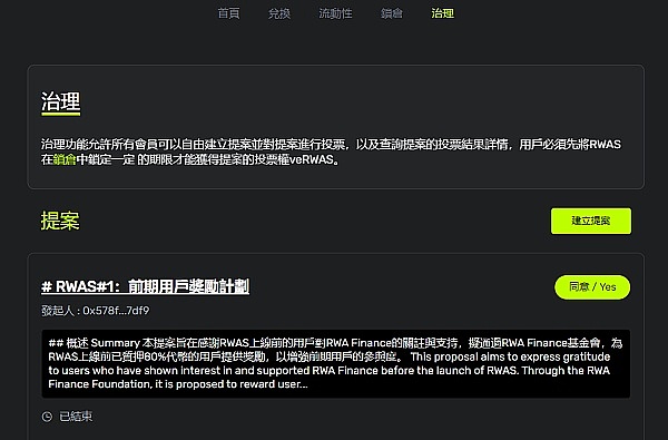 1)民主治理路径:VE池存入RWAS(获得veRWAS)——查看/发起提案——参与社区投票——提案投票通过——链上执行;