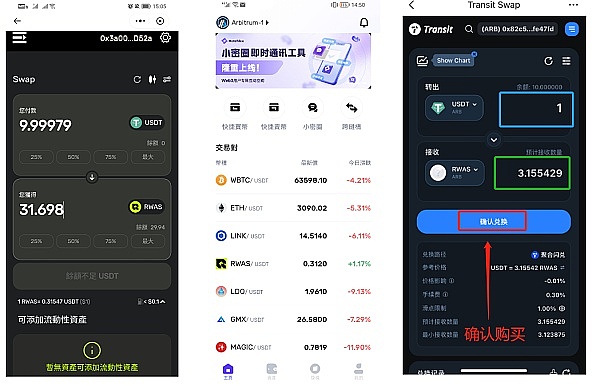 准备资产:RWAS官网Swap、UniSwap、MetaMask、TokenPocket、Rabby Wallet、MetaTdex等渠道可购买RWAS资产;USDT可以从任何平台转入,如币安、OKX、Gate等,但注意要Arbitrum链钱包。
