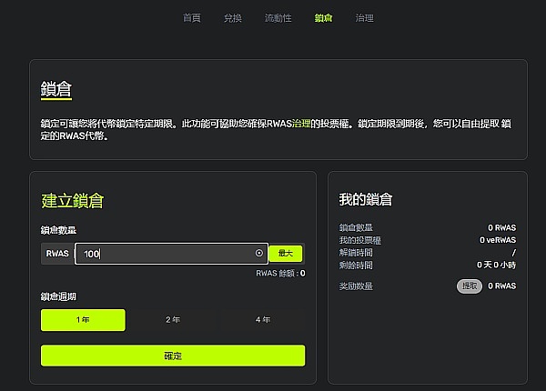 VE治理参与路径:RWAS官网——锁仓——输入RWAS/选择周期——点击确定