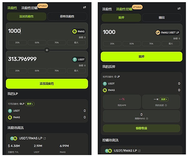 添加流动性:即在RWAS官网“流动性池”添加USDT和RWAS,你将获得一种LP Token。如截图所示,你输入一种资产数量就会显示另一种资产所需数量。如图中当我输入1000RWAS时,对应313.796999枚USDT(数值依据实时的RWAS价格变化)。