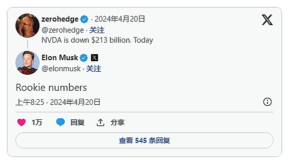 虽然Nvidia 在上周五收盘时跌幅收窄至5.6%,但这次的暴跌也让许多网友震撼到,纷纷在社群平台上卖惨取暖。有趣的是,一名网友的推文竟钓出特斯拉执行长马斯克(Elon Musk)。
