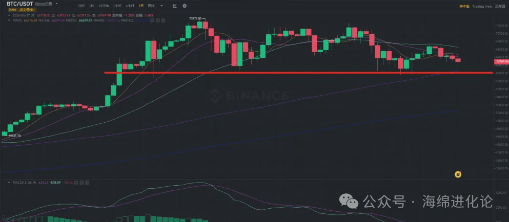 距离本周结束只剩一天,让我们来看看昨天和今天的行情走势。昨天大饼的日线收线出现了65000点的插针阴线,而今天凌晨反抽64000点回踩,行情一直在62000附近震荡。而二饼也在3060附近插针支撑后反弹,山寨币体系也没有太大的跌幅。