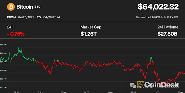 比特币(BTC)继续呈现近期的波动走势,在64,000美元附近窄幅波动,过去24小时下跌了0.9%。大市场CoinDesk 20指数(CD20)略微下跌,智能合约网络代币Solana(SOL)、ICP和去中心化交易所Uniswap的UNI下跌了2%-4%。