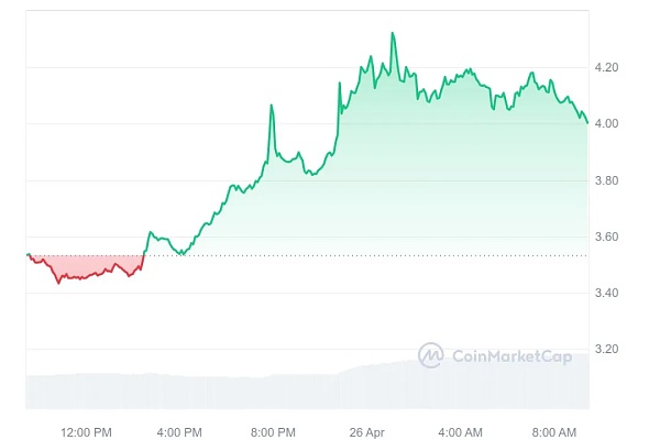 目前,HNT 价格为 4.15 美元,24 小时内上涨 17.05%。其市场主导地位为0.03%,较去年飙升124%。Helium 的交易价格高于 200 日移动平均线 83.47%,暗示可能出现超买。尽管其 30 天波动率为 17%,但流动性依然强劲,成交量与市值之比为 0.0407。