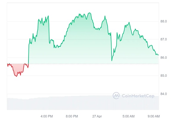 截至今日,LTC 价格为 86.14 美元,过去 24 小时交易量达到 582,053,315.43 美元。该代币盘中小幅上涨 0.65%,过去一周大幅上涨 4.45%。其流通量为 7400 万枚 LTC,市值为 6,412,332,719 美元。