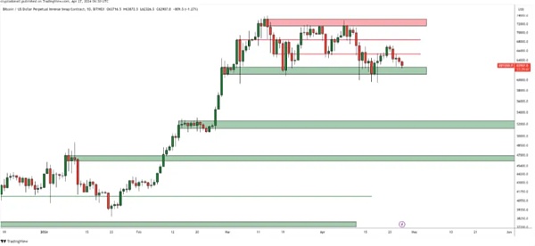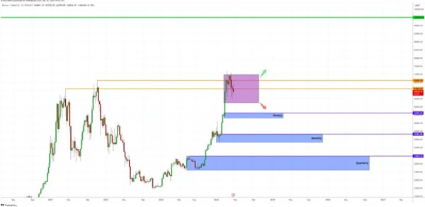 与此同时,分析师 Murad Mahmudov 提供了更细致的观点。 他关注特定范围内的短期市场走势,这将决定比特币的命运。