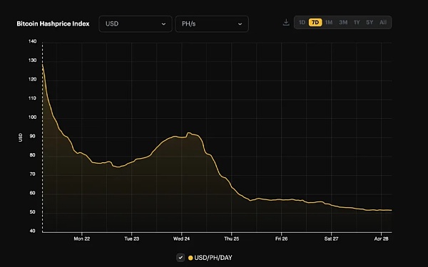 截至美国东部时间 4 月 28 日凌晨 5 点,比特币的哈希价格,或者说每天 1 PH/s 哈希算力的预期值,约为每 petahash 51.66 美元。 在减半事件(BTC 区块奖励从 6.25 BTC 减少到 3.125 BTC)之前,矿工每天每 petahash 的收入超过 100 美元。 无论从哪个角度来看,矿商的收入都大幅下跌,相当于 50% 的大幅抛售。