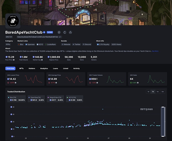 目前 NFTScan 显示, BAYC 目前地板价稳定在 15.29 ETH,最高成交价 1080.69 ETH,7d 交易额为 6.7k ETH 左右,目前以太坊上总交易额已超 1.9M ETH,过去 7 天交易分布主要为 Blur: 5.74k(84.65%),Opensea: 561.9(8.28%),MagicEden: 437.7(6.45%),X2Y2:41.99(0.62%)单位 ETH,7d 交易笔数达 463 次。