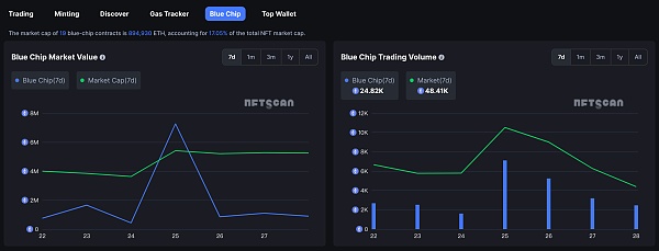 当前 19 只蓝筹合约总市值为 894,930 ETH,占 NFT 总市值的 17.05%。