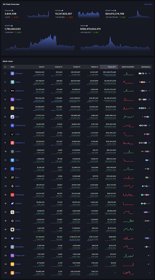 截至 2024 年 4 月 29 日,NFTScan 目前已支持 Bitcoin、Ethereum、BNBChain、Polygon、Solana、Avalanche、Arbitrum、Optimism、zkSync、Starknet、Aptos、Mantle、Linea、Base、TON、Blast、Scroll、Viction、Fantom、Polygon zkEVM、Moonbeam、PlatON、Cronos、Gnosis 24 条主流区块链网络,共产生: