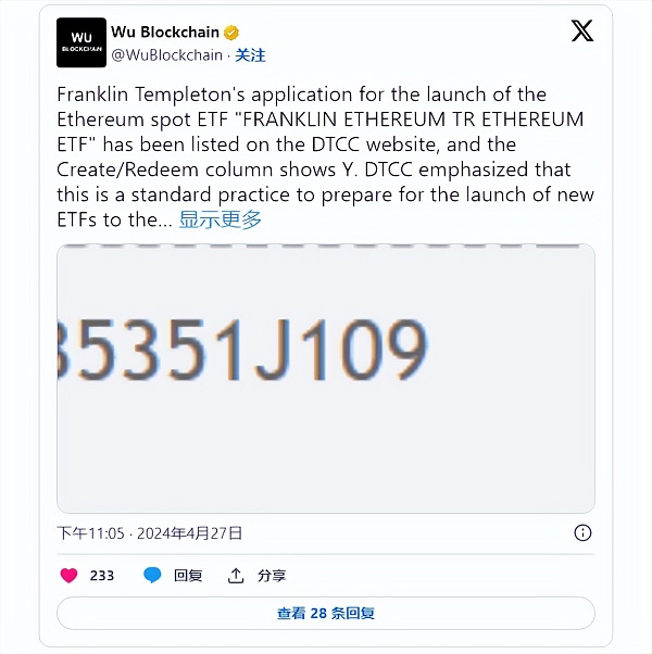 事实上,富兰克林邓普顿发行富兰克林以太坊TR以太坊ETF(EZET)的申请已在DTCC网站上列出。