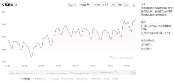 区块链浏览器TRONSCAN数据显示,近30日,波场TRON日均交易数超553万,环比增长2.6%。