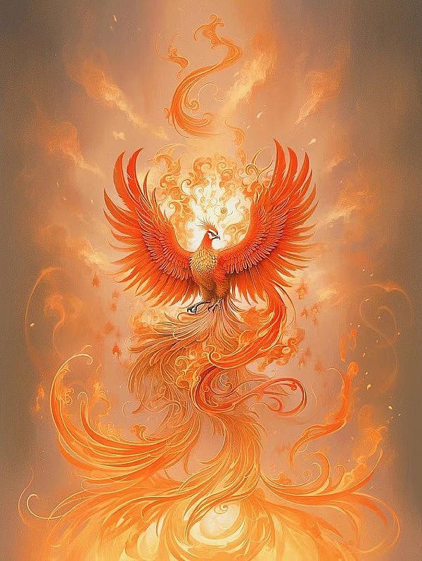 火凤凰的羽毛燃烧着熊熊烈火,但它并不被烧毁,反而能够焕发出更加灿烂的光芒,象征着重生和变革,代表着从毁灭到重生的转变,寓意着希望和新的开始。