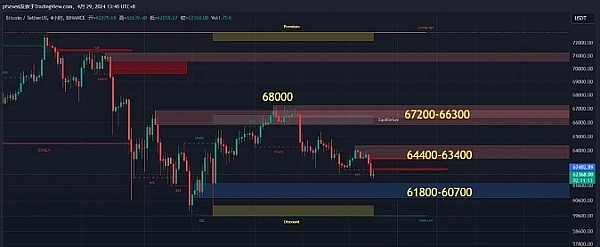 4H没有延续反弹,继续震荡下跌,同样是缩量下跌,同时也出现了第三个低点,时间上下跌第7天,明天是个变盘节点;空间上已经接近4H61800-60700需求区,结构上下降通道最后大概率是向上。关注晚间价格的表现,是否形成吸筹买入机会!
