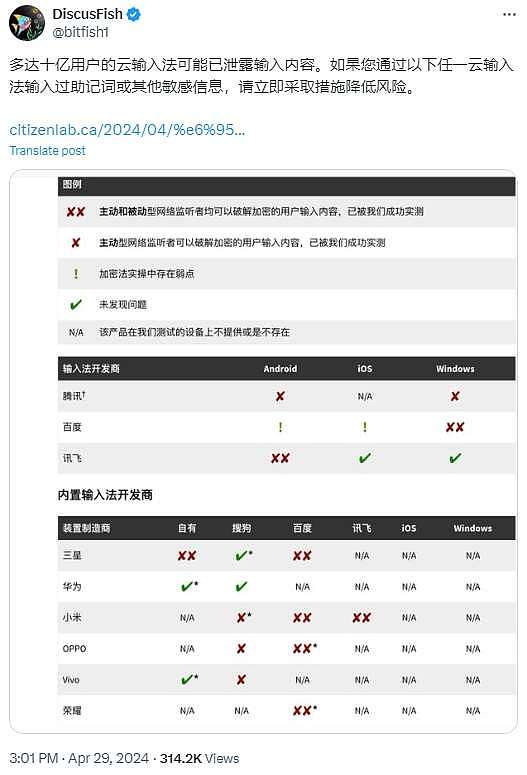 根据神鱼的推文引述,数字监督组织公民实验室(The Citizen Lab)分析了9家提供软件的公司,包括百度、荣耀、华为、讯飞、OPPO、三星、腾讯、VIVO和小米,其中8家的输入法软件包含严重的漏洞,仅华为幸免于难。