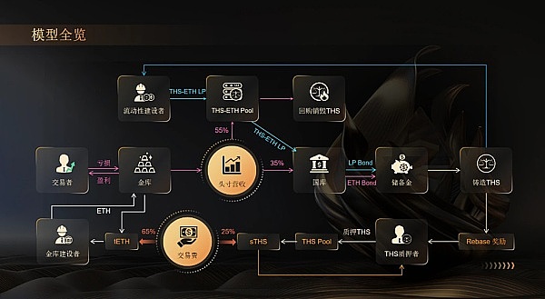 衍生品交易者通过做空、做多某一标的,从金库(Vault)赚取 ETH,或者损失头寸 ETH 进入金库,长周期看,交易者将损失头寸,此时金库将超额抵押,超额抵押达到 20% 时,超出部分 55% 用于在 THS-ETH Pool 回购 THS 销毁, 35% 进入国库(Treasury)作为 THS 铸币储备金,同时提高 THS 支撑价。