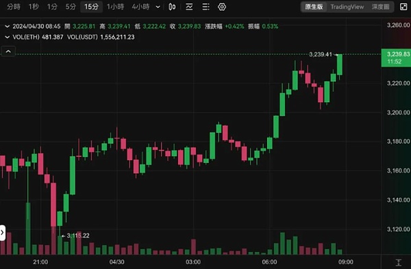 以太坊的波动又更剧烈一些,昨晚最低插针3,115 美元之后,清晨最高来到3,235 美元。撰稿当下报3,239 美元、近24 小时下跌1.32%。