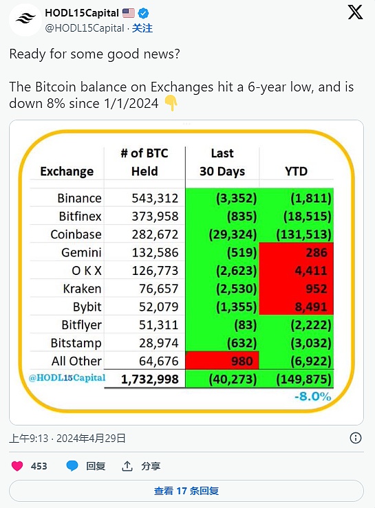 根据HODL15Capital 于29 日最新统计数据指出,交易所的比特币余额目前正创下6 年来新低,2024 年迄今已下降了8%。