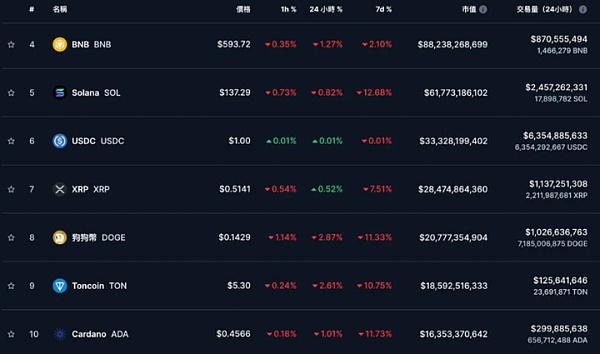 CoinMarkeCap 数据显示,其他前十大代币由于昨日跌幅较深,近24 小时多数也下跌,除了XRP 还保持0.52% 的涨幅之外、其他包括BNB、SOL、DOGE、TON…等代币都有约1~2% 的跌幅。