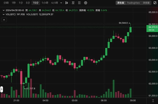 比特币BTC在昨(29)日持续震荡走低,晚间21 点之后更一度下探61,787 美元;不过随后买盘涌现,拉回到6.3 万美元盘整之后,撰稿当下触及64,544 美元,近24 小时上涨1.98 %。