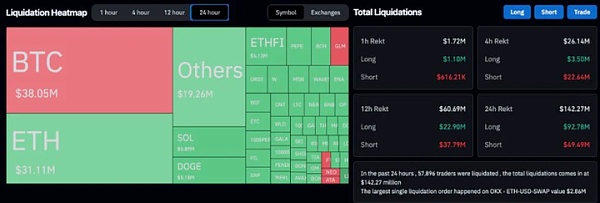比特币先是下跌再回弹的行情,据Coinglass数据显示:过去24 小时,加密货币全网爆仓金额超过1.4 亿美元、超过5.7 万人遭清算,主爆多单。