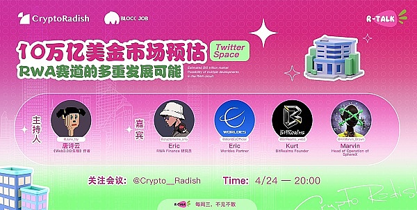 4月24日,RWA Finance受邀参加了《10万亿市场预估,RWA赛道的多重发展可能》推特直播。聚焦RWA,CryptoRadish、BLOCK JOB、Worldes、SphereX等项目专家与RWA Finance研究员Eric深入探讨了行业未来发展模型和金融畅想,吸引了4000度名全球华人参与聆听。