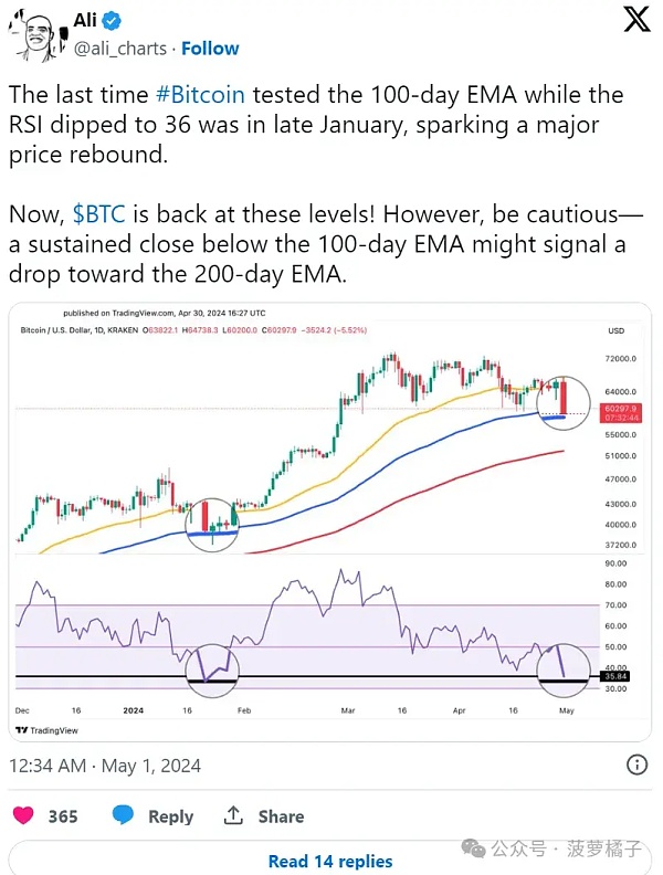 比特币价格扩大了跌幅,截至发稿时交易价格为 59,500 美元。自 2022 年 11 月 FTX 崩盘以来,4 月份是比特币表现最差的一个月。市场分析师指出,如果比特币价格跌破 58,000 美元(即 100 日均线),比特币价格将进一步下跌至 52,000 美元。