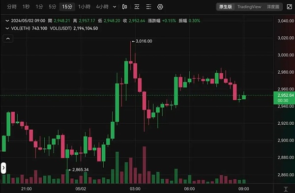 以太坊的下跌幅度则较低些,在差不多时间最高触及3,016美元之后,截稿前线报2,952美元,近24小时下跌1.24%。