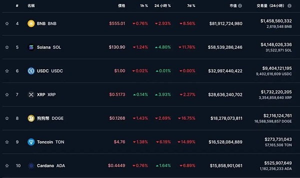 CoinMarkeCap数据显示,其他前十大代币涨跌不一。其中SOL、XRP近24小时分别上涨4.8%和3.9%。跌幅最的则是TON,下滑6.19%。