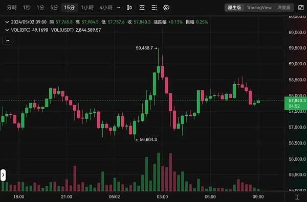 在加密市场方面,比特币波动剧烈。在利率公布以及鲍威尔记者会之前,BTC一度从56,604美元拉涨到59,487美元,但消息公布之后,很快地又向下暴跌,涨幅几乎全数回吐。