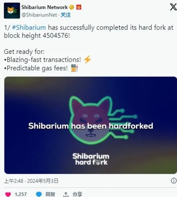 根据官方公告,柴犬(SHIB)的 Shibarium 第 2 层网络已完成硬分叉。根据公告,硬分叉将让位于“极快的交易”和“可预测的汽油费”。