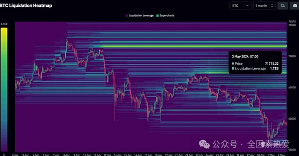 特别是,比特币的卖空者清算价值超过 17.2 亿美元,价格为 71,715 美元。然而,CoinGlass 的1 个月热图也显示出 67,420 美元的大量流动性以及两个关键区域周围较小的资金池。