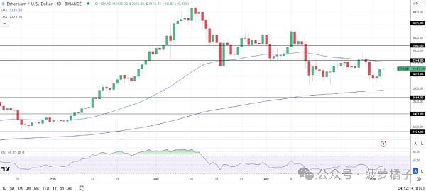 14日RSI读数为46.45,表明以太币在进入超卖区域之前先跌至200日均线。