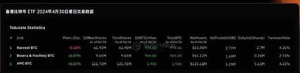根据 SoSo Value 数据,截至 4 月 30 日收盘,除了嘉实比特币现货 ETF (3439.HK)和嘉实以太坊现货 ETF(3179.HK)分别产生了 -0.18% 和 -0.19% 的负溢价外,其他产品均为正溢价,且盘中交易过程中最高产生了 0.33% 的正溢价,首日卖盘克制,买盘相对强劲。考虑 ETF 上市首日有做市商影响,此折溢价数据可以持续观察,如果可以持续维持正溢价,则有望持续吸引投资者申购,尤其是持币投资人的认购,则香港加密现货 ETF 的规模将超过 5 亿美金的预估值;而如果转为负溢价,则要警惕套利交易赎回 ETF 份额,ETF 发行方卖出加密货币,带动加密市场下行。