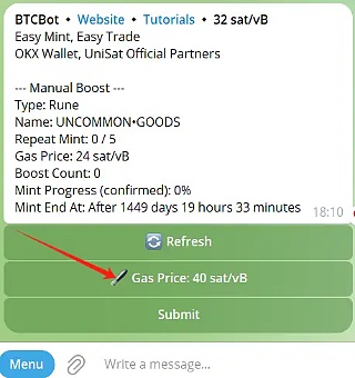 BTCBot 功能更新,支持更专业的符文蚀刻模式,专业用户可以设置固定 gas 价格进行 mint 蚀刻,而且在 mint 蚀刻过程中可设置目标 gas 价格,手动进行多次加速。具体操作如下: