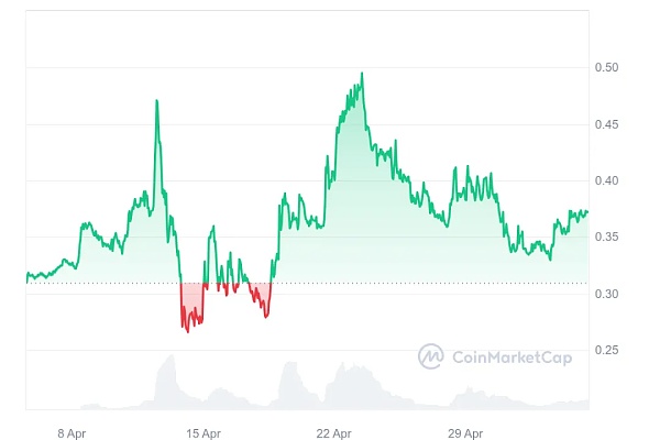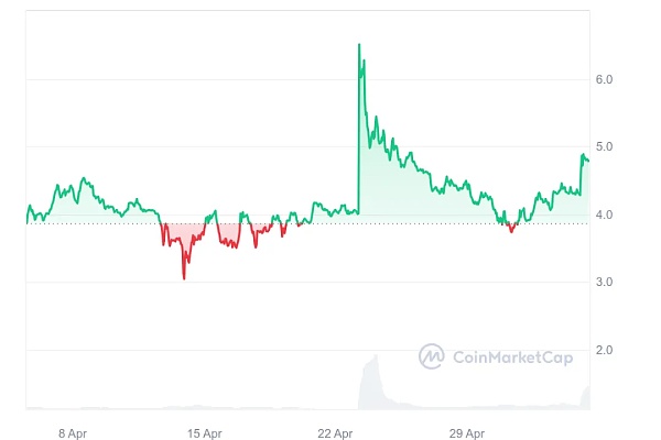 Akash Network 的价值大幅上涨,目前交易价格为 4.80 美元。如今,它成为市场上涨幅最大的股票之一,价值上涨了 9.55%。值得注意的是,它的交易价格一直高于 200 日移动平均线,表明其表现持续积极。