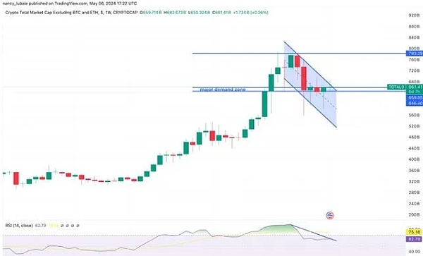 下图显示,TOTAL3 自 4 月第一周以来下降了 15%,至 6614.1 亿美元。这种回调导致周线图上出现下降平行通道,如下所示。