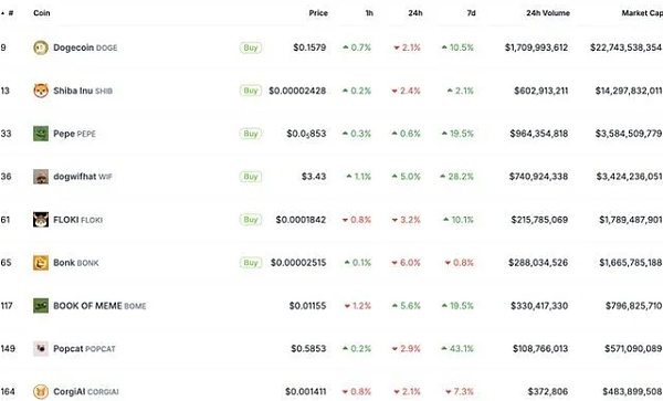 Bonk (BONK) 跌幅最大,在过去 24 小时内损失了 6% 的市值。 Floki (FLOKI) 下跌 3.3%,紧随其后,Memecoin (MEME) 同期下跌 3%,位居第三。