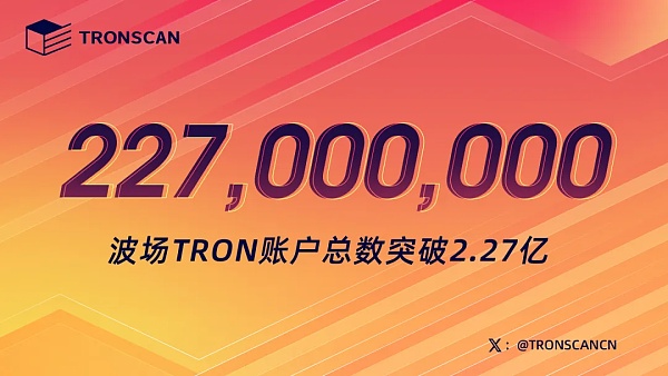 区块链浏览器TRONSCAN最新数据显示,截至2024年4月30日,波场TRON账户总数达到227,120,061,正式突破2.27亿。