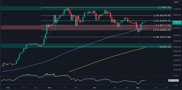 尽管如此,比特币在关键区域 0.618(59,395 美元)斐波那契回撤位找到了重要支撑,与重要的 100 日移动平均线 59,000 美元保持一致。该区域引发了看涨逆转,提高了人们对中期重新出现积极趋势的预期。