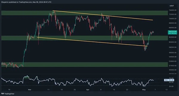 对日线图进行全面审查后,很明显,比特币在 5.9 万美元至 7.2 万美元的关键价格区间内经历了长期的横盘整理阶段。