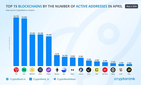 CryptoRank最新发布的4月月活跃地址数前十五的区块链榜单显示,波场TRON以5470万高居第一,领先于Near、BNB Chain、Solana等区块链。