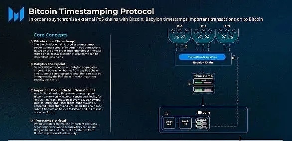 Babylon的时间戳协议允许PoS区块链发布任意数据以及与比特币网络通信,并可检索时间戳,这些时间戳可用于同步通过比特币区块链上的BTC质押获取安全性的各网络。