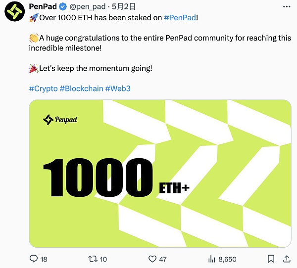 Penpad是Scroll生态发展早期备受关注的LaunchPad,目前其也正在向收益聚合器以及RWA等方向拓展。在前不久,其推出生态首个资产PDD的LaunchPad活动中,就获得了Scroll社区以及官方的大力支持。我们看到,其在该Launch的Season 2活动中(用户质押ETH获得Penpad积分,以获得PDD额度分配),目前已经质押了超过1000个ETH,TVL超300万美元。