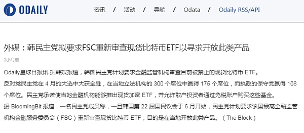 外媒:韩民主党拟要求FSC重新审查现货比特币ETF以寻求开放此类产品