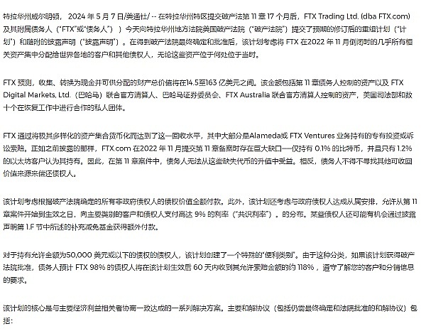 FTT提交的一份文件中,重组团队列出向债权人分配现金并且结束「破产法第11 章」的新细节,将有98 % 的债权人将在计划获得法院认可后,于60 天内向债权人发送118% 的损失赔偿。