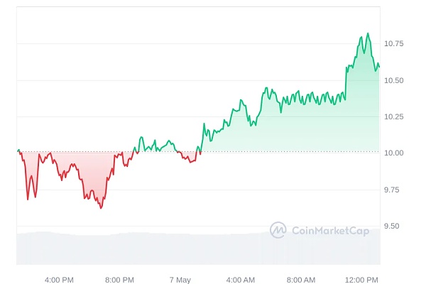 Render Token 近期经历了显著的增长,其价格在过去六个月内上涨了 345%。过去一周,该代币的价格上涨了 31.68%,显示出强劲的上涨趋势。目前,其交易价格在 7.84 美元至 10.96 美元之间波动,预计关键阻力位为 12.04 美元,支撑位为 5.80 美元。