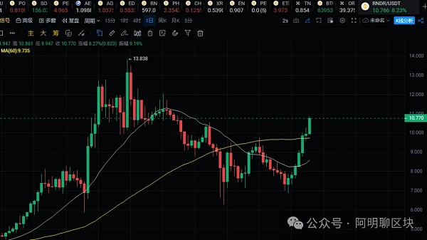 RNDR最新成交价格9.98美元,24小时内涨幅率为13%左右;