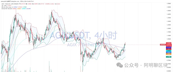 AGIX最新成交价格为0.98233美元,24小时涨幅率为13%左右;