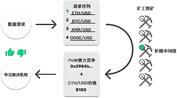 它创建了一个独立的网络内数据系统。用户可以通过合约向系统请求读取数据。Tellor 将在收到请求后根据用户的不同需求在系统内查询并关联相关数据。